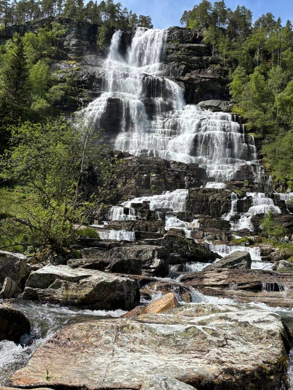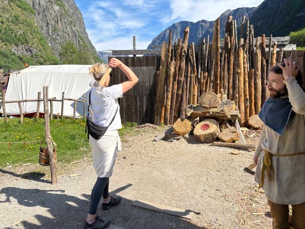 We begin with a stop at the spectacular Tvinnefossen Waterfall, perfect for photos and fresh mountain air. Then we head to Gudvangen, home of the authentic Viking Village, where you can walk among longhouses and warriors from the past.